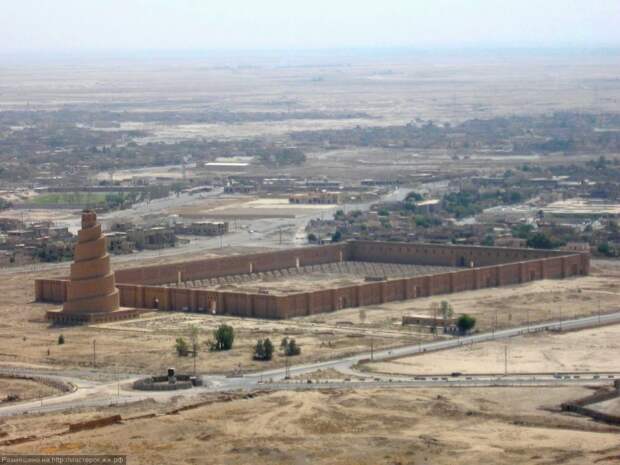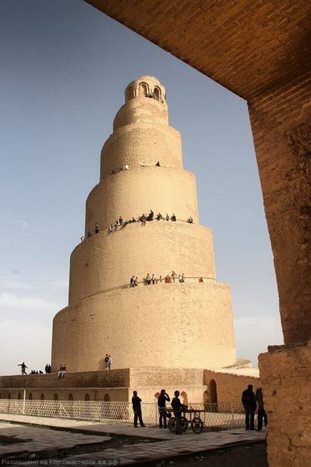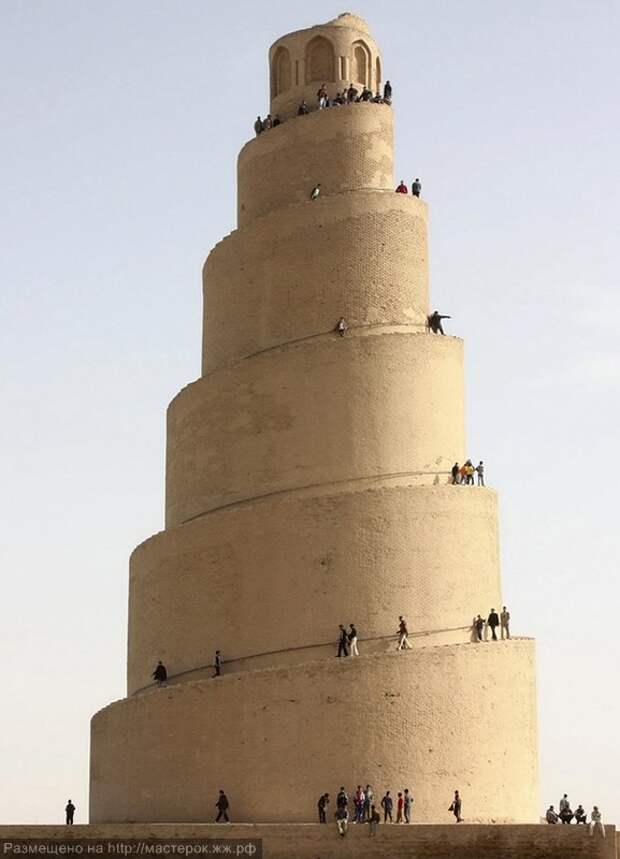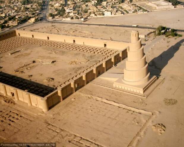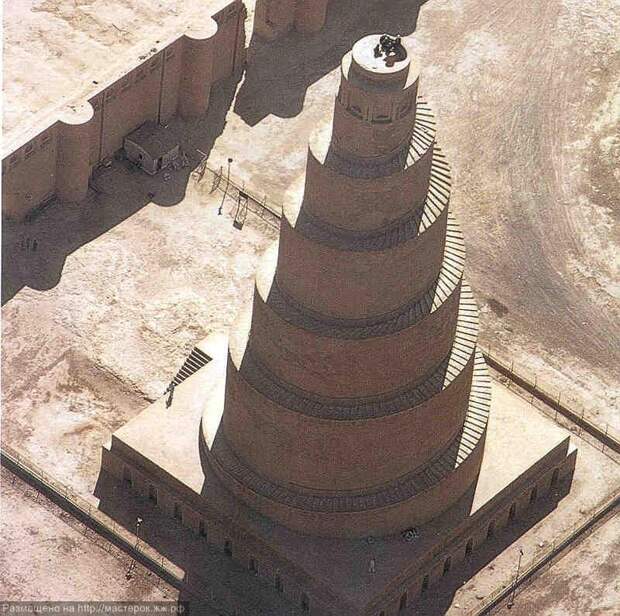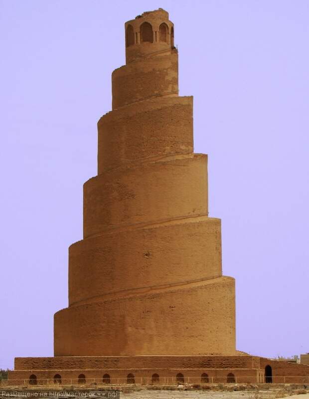 инарет аль-Мальвиййя, ставший своего рода символом С. как столицы халифата Аббасидов, – замечателен не столько своей архитектурной необычностью, сколько связанными с ней символическими коннотациями. Мощное основание, сравнимое по размерам с высотой минарета (квадрат со стороной 33 м), придает постройке сходство с пирамидой, а ярусная конструкция однозначно ассоциируется с тем зиккуратом, который описал Геродот, т.е. с «Домом основания небес и земли», Вавилонской башней (Быт 11:4). Особенно показательно наличие внешней лестницы, связывающей основание и верх минарета; в зиккуратах этот архитектурный элемент наделялся важной сакральной функцией – пути нисхождения божества с небес на землю. Иудейские и христианские экзегеты усматривали в возведении Вавилонской башни мотив богоборчества. В средневековых мидрашах проводятся параллели между ее сооружением и мятежом «сынов божьих» Быт 6:2 (2 Ен 7), вынудившим Бога истребить падшую тварь Потопом, а царь-идолопоклонник Нимрод, начавший строительство, уподобляется падшему ангелу Шемхазаю. В мусульманской экзегетике, особенно в персидских тафсирах, Нимрод – не просто тиран и идолопоклонник, которому противостоит пророк Ибрахим (Авраам), но неистовый супостат Бога; потерпев неудачу в строительстве башни, он пытается взлететь на небо, а в ответ на предложение покаяться вызывает Бога на бой и гибнет. В свете сделанных уточнений придание облика зиккурата минарету столичной соборной мечети не может восприниматься иначе как самоотождествление халифа мусульман с царем-богоборцем.